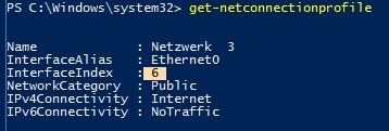 Der Befehl „get-netconnectionprofile“ zeigt alle verfügbaren Netzwerkadapter und deren verwendetes Firewallprofil: