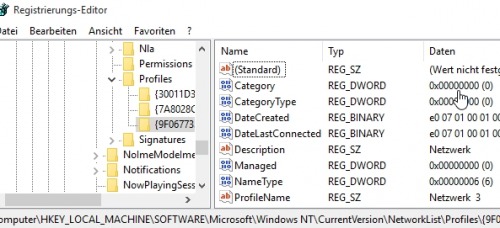 In dem Ordner des Netzwerkadapters, kann mit dem Key „Category“ das Firewallprofil angepasst werden: