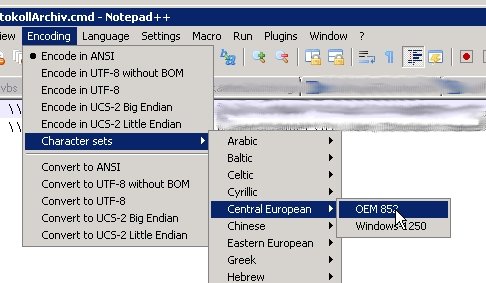 Wer die Eingabeaufforderung weiter mit 850 betreiben will, kann alternativ mittels Notepad++ den Zeichensatz der Datei auf 850 oder 852 stellen: