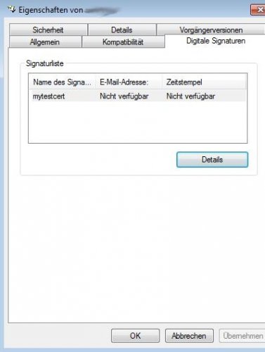 Lösung 2 die Datei mit einem self signed Zertifikat signieren: