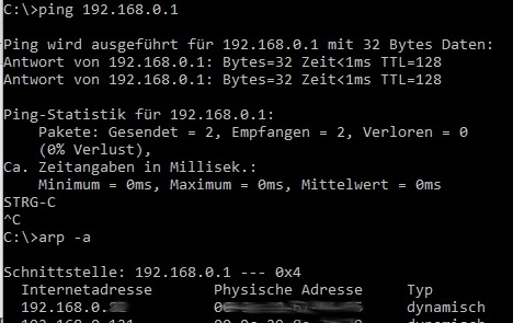 Die Antwort heißt in diesem Fall: das Gerät mit 192.168.0.1 ist erreichbar und befindet sich in unmittelbarer Nähe, da Zeit<1ms