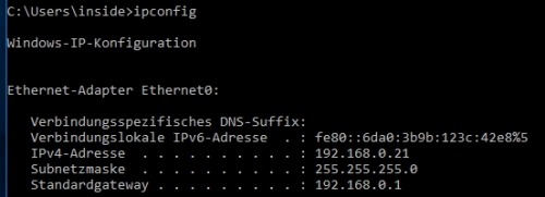 Die IP-Adresse oder Netzwerkadresse kann mit dem Befehl ipconfig ausgelesen werden: