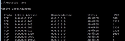 Der Befehl: netstat -ano gibt eine Liste aller Netzwerkverbindungen aus.