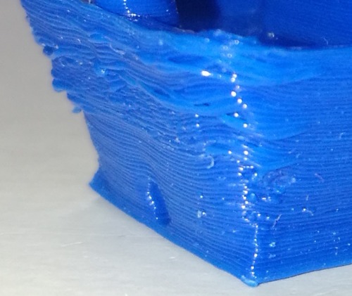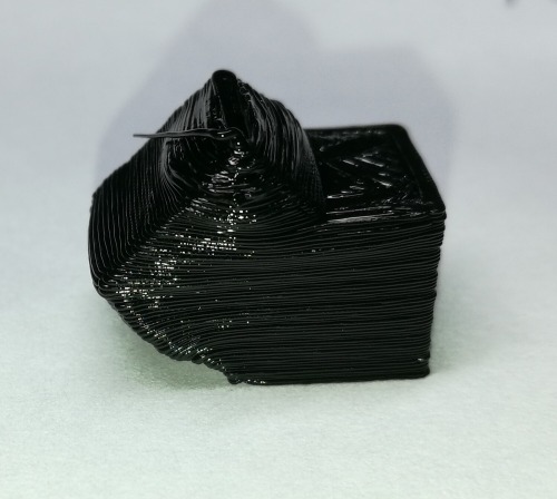 Ohne Zusatz-Lüfter auf die Druckdüse (Cooling-Fan) wird das Filament zu langsam fest, das Druckbild schaut dann in etwa so aus: