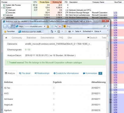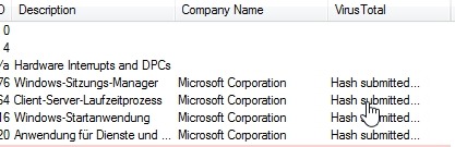 Mit dem kostenlosen Tool Process Explorer von Sysinternals (Microsoft) können alle laufenden Prozesse in Sekunden auf Viren geprüft werden. Dazu sendet Process Explorer die Hash-Werte der aktiven Tasks zu VirusTotal.com. VirusTotal vergleicht die Hash-Werte mit den gespeicherten Werten aller bekannten Virenscanner.