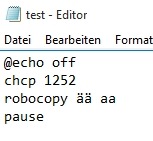 Problem gelöst:cmd, BATch Umlaute Windows robocopy chcp 1252