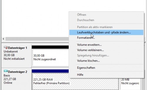 Dazu Rechtsklick auf das Windows Symbol: "Datenträgerverwaltung"