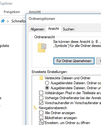 Um Ordner hinzuzufügen, müssen diese in die Bibliothek aufgenommen werden, dazu im Explorer auf Ansicht, Ordneroptionen und "Bibliotheken anzeigen":