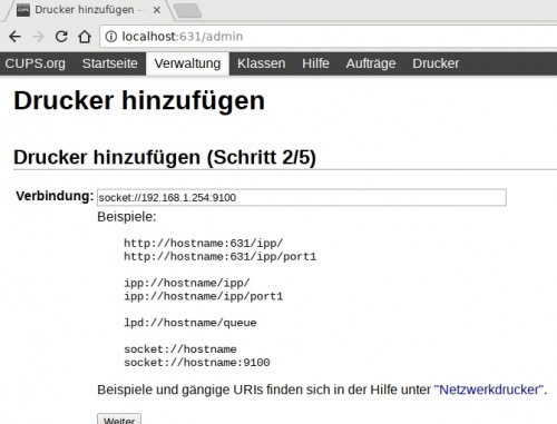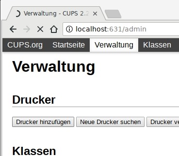 Nach dem Start des Containers kann der Druckserver im Browser verwaltet werden: localhost:631 oder IP-Adresse:631