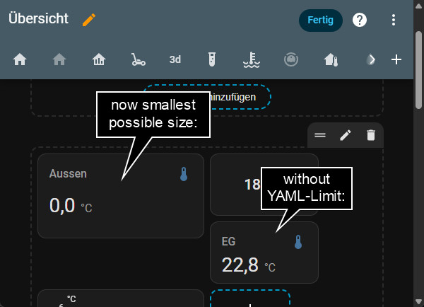 I just created a Github pull request for Home Assistant to customize the sizes of the Lovelace maps almost arbitrarily: The change allows columns and rows smaller than the minimum values specified in the grid_options settings. Background: Creating a dashboard for mobile device or dashboards has become quite a challenge as some cards are much too large.