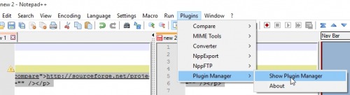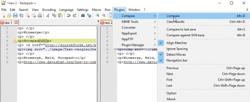 With the Compare Plugin in Notepad++ 2 text files can be compared with each other: Differences are marked. The plugin can be activated with the Plugin Manager. Click on "Plugins", "Plugin Manager", "Show Plugin Manager".