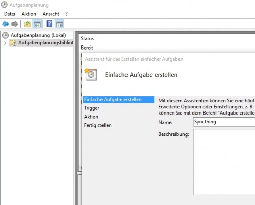 In Windows kann Syncthing automatisch in der Aufgabenplanung gestartet werden: