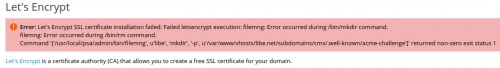 Failed letsencrypt execution: filemng: Error occurred druing /bin/mkdir command. filemng: Error occured during /bin/rm command.