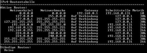 Der Befehl route print listet alle aktiven Routen der Routingtabelle.