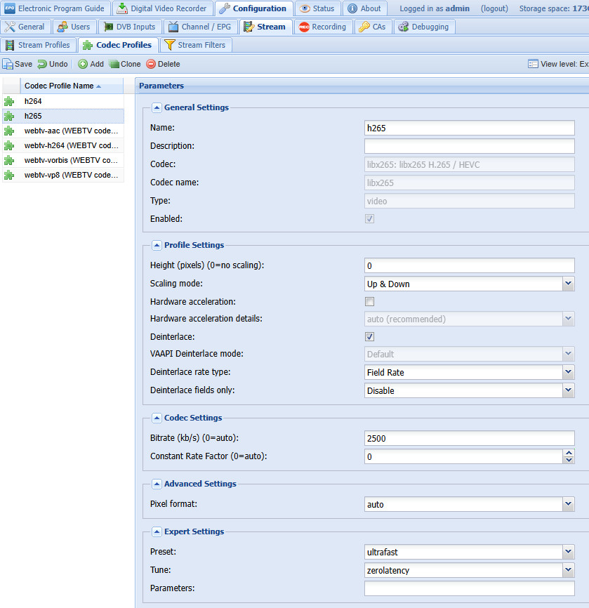 Wer einen halbwegs performanten Mini-PC einsetzt, kann die Aufnahmen on the fly als H.264 oder noch besser mit H.265 transkodieren, wodurch diese sehr wenig Speicher benötigen und dennoch eine sehr gute Qualität aufweisen. Für HD-Qualität wird der Stream mit H.265 von etwa 10 kB/s auf 2,5 kB/s reduziert. Dabei erreicht die CPU meines Mini-PCs pro Stream eine Auslastung von etwa 25%, beim Einsatz von bis zu 3 Tunern: kein Problem.