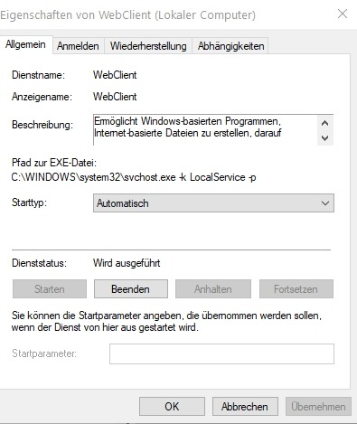 Die Ursache des Problems ist der nicht gestartete Dienst "Webclient".